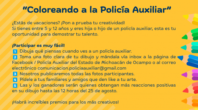 • A través de concurso de dibujo infantil; se premiarán los 3 primeros lugares Morelia, Michoacán, 1 de agosto del 2025.- La Policía Auxiliar convoca a participar en el primer Concurso de Dibujo Infantil 2025, titulado “Coloreando a la Policía Auxiliar”, como una actividad recreativa dirigida a hijas e hijos de los elementos operativos durante […]