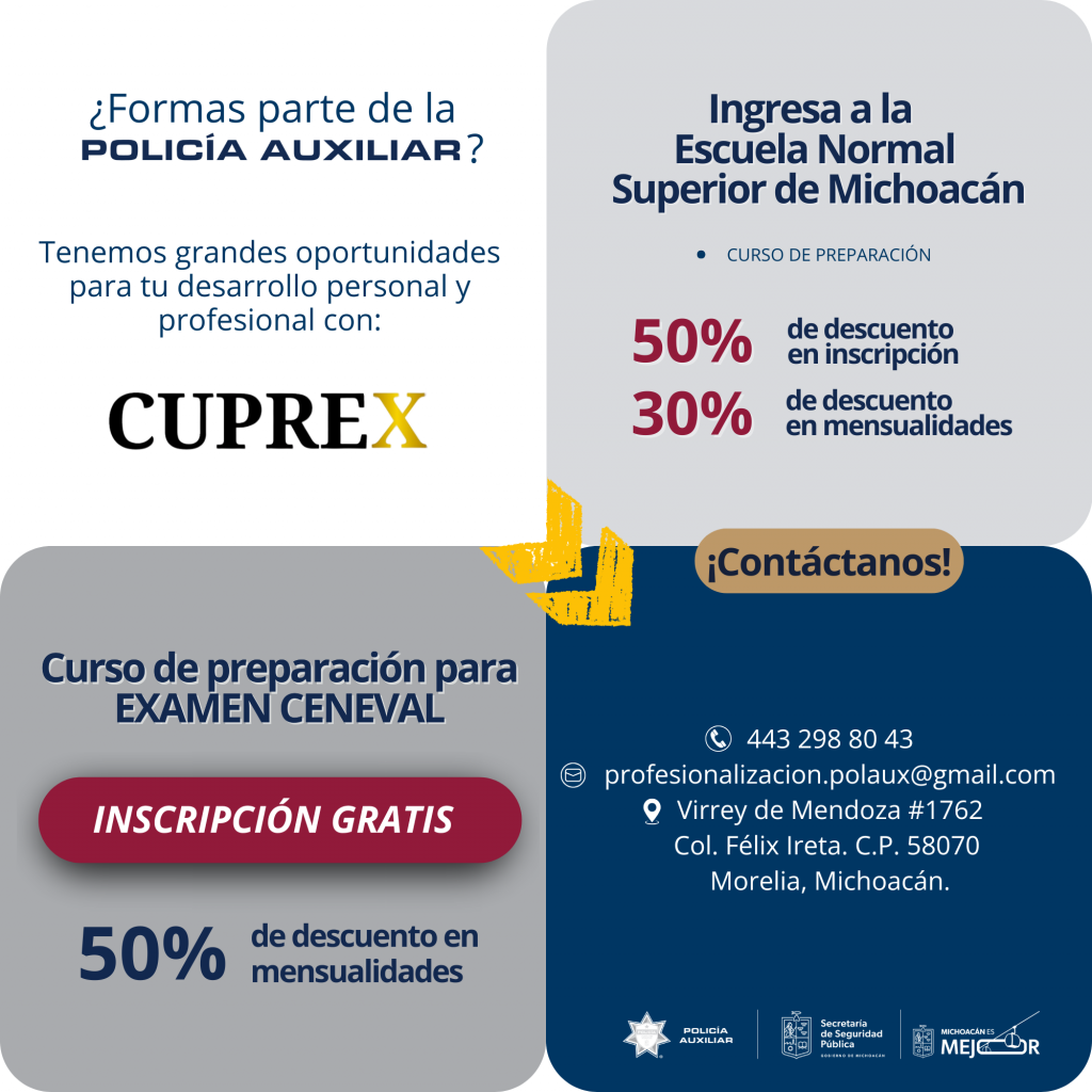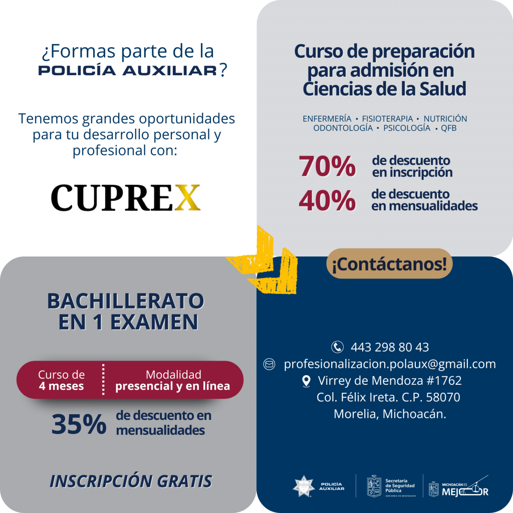 Por su parte, CUPREX ofrece diversas alternativas académicas con descuentos del 30 al 70 por ciento en inscripción y mensualidades, entre ellas está el bachillerato por examen único, cursos de preparación para licenciaturas en Ciencias de la Salud, preparación para examen Ceneval y curso para ingreso a la Escuela Normal Superior de Michoacán.