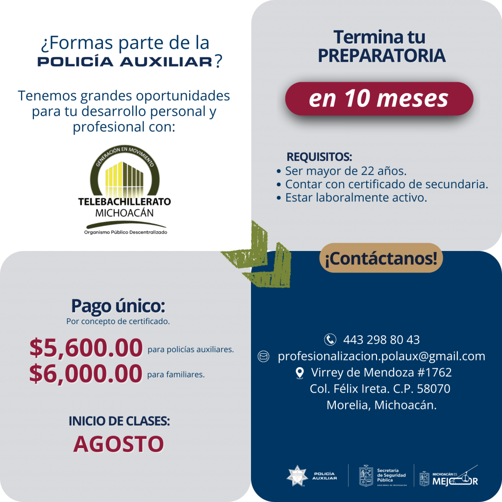 En coordinación con Telebachillerato Michoacán, el personal operativo podrá concluir su educación media superior en un periodo de diez meses, bajo un esquema accesible que contempla un pago único por concepto de certificado. Para las y los policías auxiliares el costo será de 5 mil 600 pesos, mientras que para familiares directos será de 6 mil pesos. En ambas modalidades, el pago podrá realizarse en dos exhibiciones.